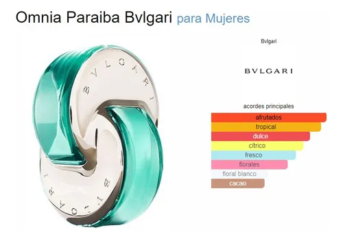 Omnia Paraiba de Bvlgari es una fragancia de la familia olfativa Floral Frutal para Mujeres. Omnia Paraiba se lanzó en 2015. La Nariz detrás de esta fragrancia es Alberto Morillas. Las Notas de Salida son maracuyá (fruta de la pasión) y naranja amarga; las Notas de Corazón son flor de pasionaria y gardenia; las Notas de Fondo son vaina de cacao y vetiver.