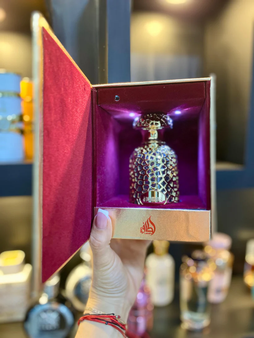 Emeer de Lattafa Perfumes es una fragancia de la familia olfativa Amaderada Aromática para Hombres y Mujeres. Esta fragrancia es nueva. Emeer se lanzó en 2024. Las Notas de Salida son limón (lima ácida), bergamota, esclarea y bayas de enebro; las Notas de Corazón son té Blanco, sándalo, cardamomo y incienso de olíbano (franquincienso); las Notas de Fondo son ámbar gris, cedro, cachemira y pachulí