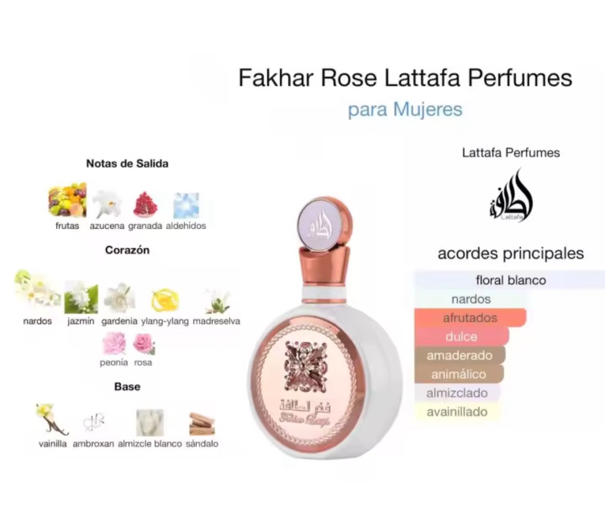 Fakhar Rose de Lattafa Perfumes es una fragancia de la familia olfativa Floral para Mujeres. Esta fragancia es nueva. Fakhar Rose se lanzó en 2022. Las Notas de Salida son frutas, azucena, granada y aldehídos; las Notas de Corazón son nardos, jazmín, gardenia, ylang-ylang, madreselva, rosa y peonía; las Notas de Fondo son vainilla, almizcle blanco, sándalo y ambroxan.